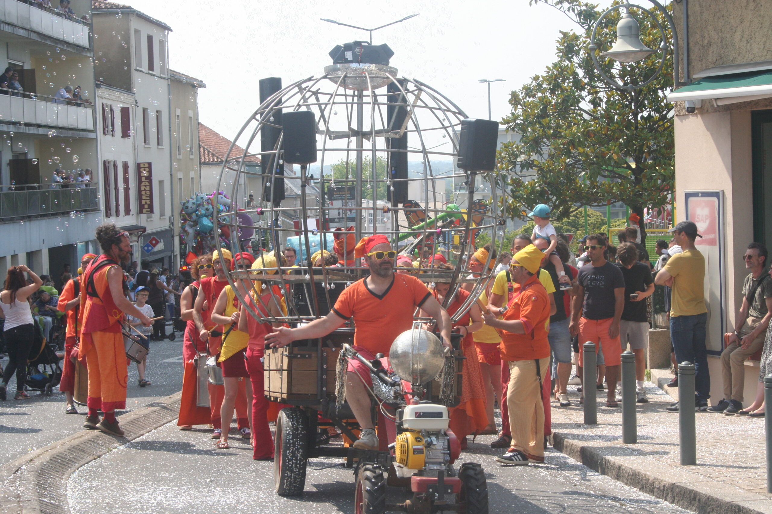 Une batucada accompagne un cavaquinho, une basse, des chanteuses et chanteurs de musiques populaires brésiliennes ,avec pour outils de diffusion sonore ,une bulle à facettes géantes tractée par un motoculteur, irriguant le public de vibrations sonores et de de b...