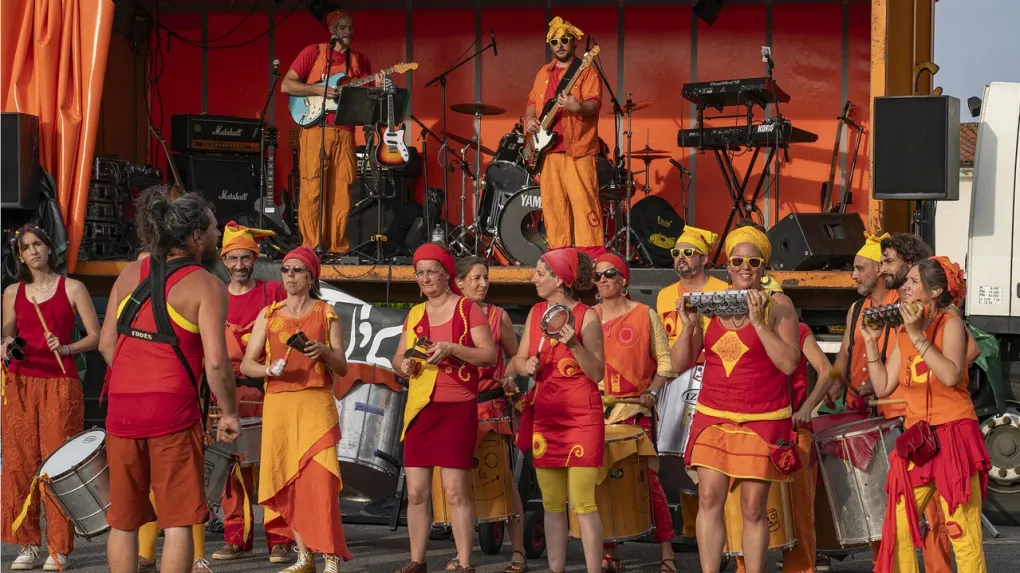 Une batucada accompagne un cavaquinho, une basse, des chanteuses et chanteurs de musiques populaires brésiliennes ,avec pour outils de diffusion sonore ,une bulle à facettes géantes tractée par un motoculteur, irriguant le public de vibrations sonores et de de bulles de savon, !